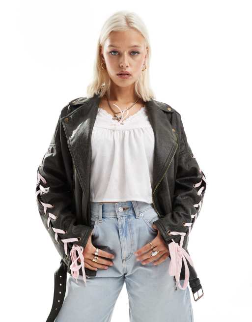 Labelrail x Daisy Birchall – Svart jacka i sliten läderimitation med rosettärmar