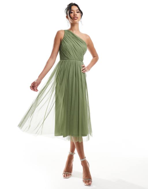 Lace & Beads – Brudtärnor – Olivgrön, enaxlad midiklänning i tyll
