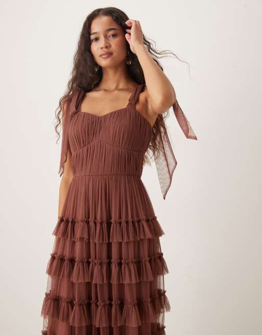 Lace & Beads – Brunrosa midiklänning i tyll med rosett på axeln