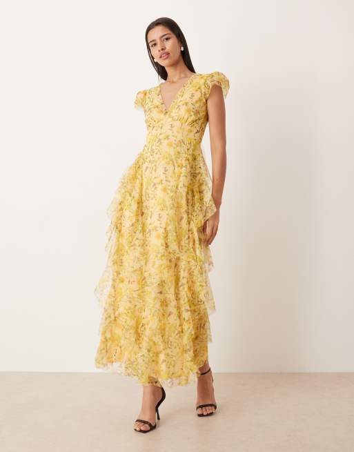 Lace & Beads – Gul, blommig maxiklänning med v-ringning, volanger och fransar i tyll