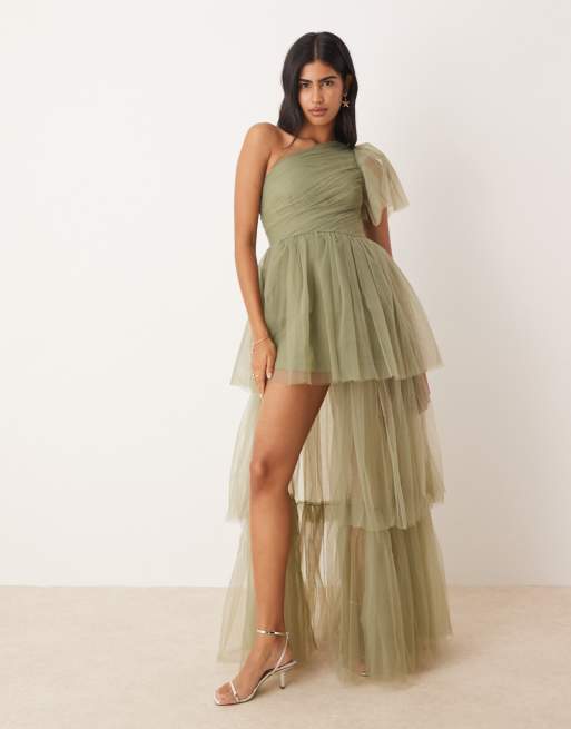 Lace & Beads – Ljus olivgrön, enaxlad och panelsydd maxiklänning i tyll