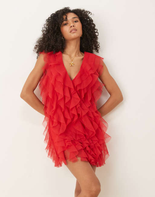 Lace & Beads – Röd miniklänning i vattenfallsstil med volang