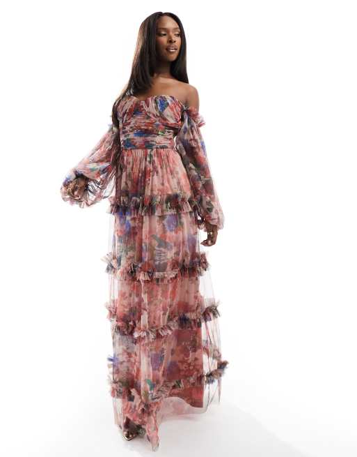 Lace & Beads – Rosa, blommig maxiklänning med skira ärmar och volang i tyll