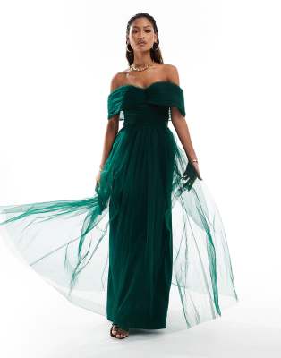 Lace & Beads – Skogsgrön maxiklänning i tyll och off shoulder-design med rosett