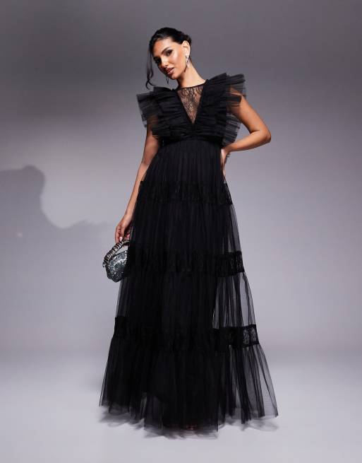 Lace & Beads – Svart maxiklänning i tyll med spetsinfällningar