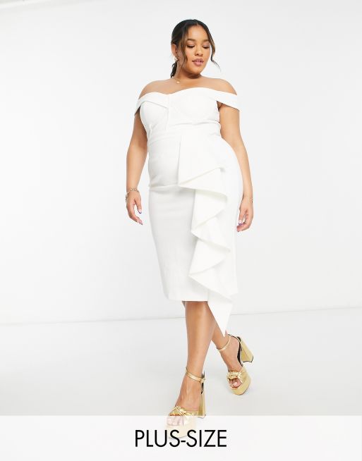 Lavish Alice Plus – Vit midilänning med off shoulder-design och volang