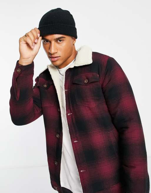 Le Breve – Vinröd rutig jacka med krage och foder i teddy