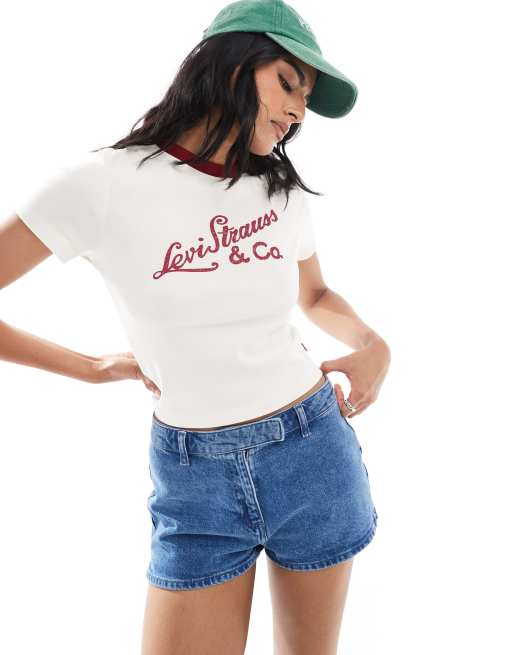 Levi's – Krämvit t-shirt med sportig skriftlogga från arkivet och kantrand
