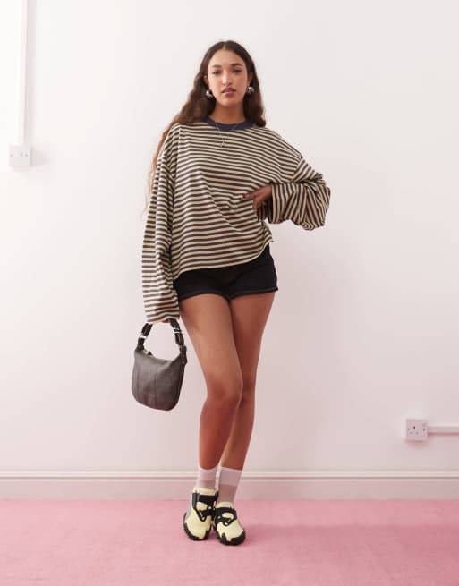 Lioness – Bloom – Beige, marinblårandig och boxig t-shirt i bomullsmix med långa ärmar och rund halsringning