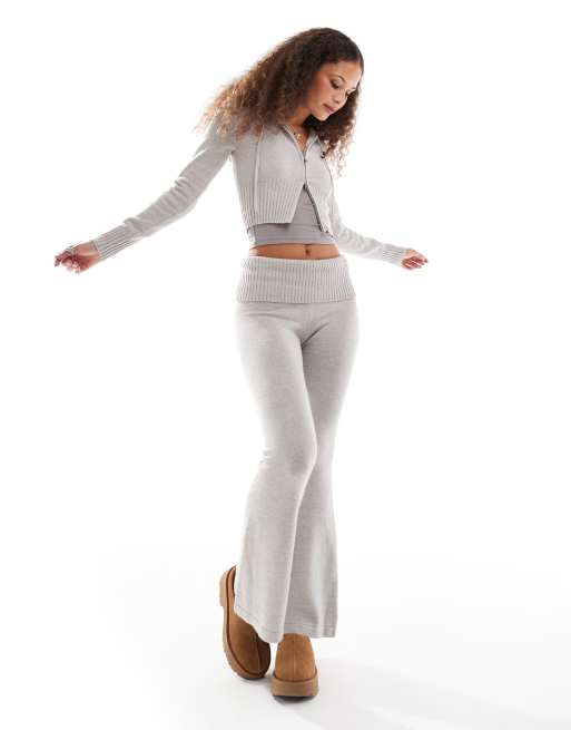 Lioness – Ljusgrått, stickat set med hoodie med dragkedja och utsvängda byxor