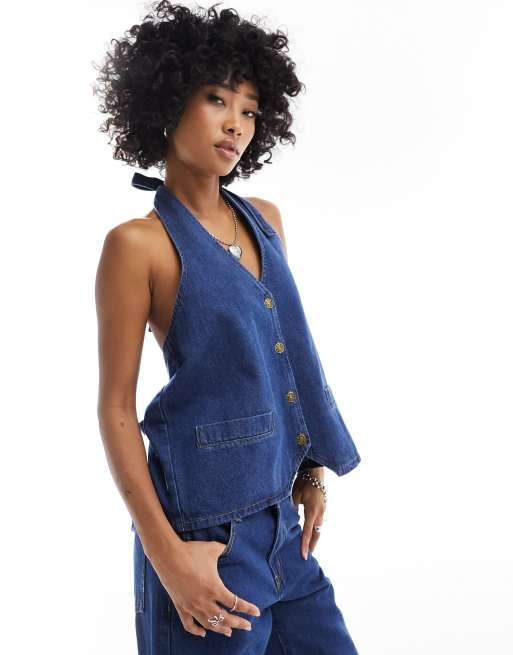 Lioness – Mörkblå kostymväst i denim med låg rygg och knytning baktill, del av set
