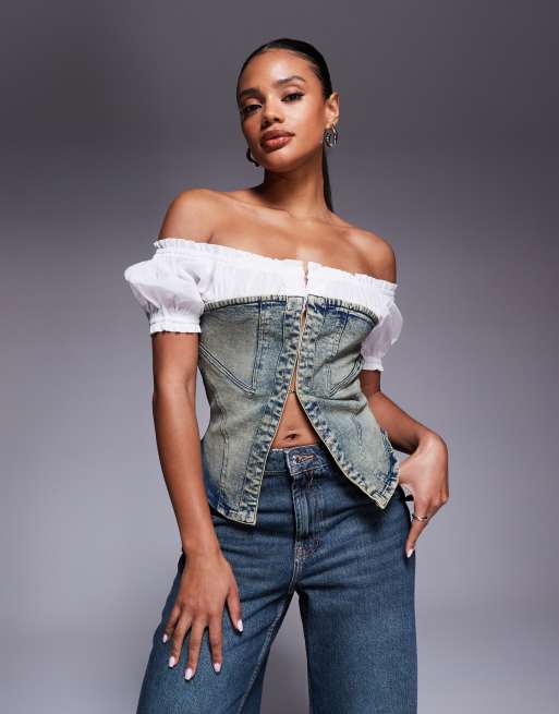 Liquor N Poker – Blå, stentvättad denimkorsett i milkmaid-stil med hyskor och hakar