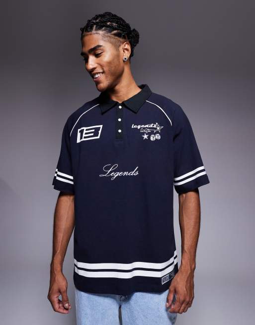 Liquor N Poker – Marinblå pikétröja i oversize med logga och kontrastfärgade ränder och krage