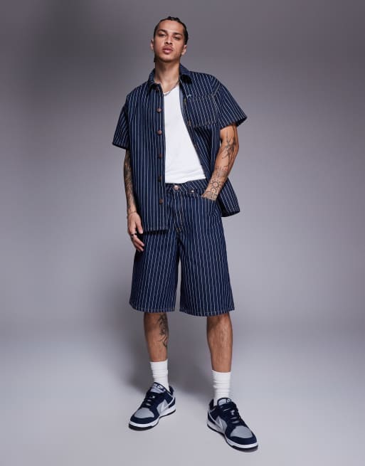 Liquor N Poker – Mörkblå, kritstrecksrandiga, långa jeansshorts i oversize