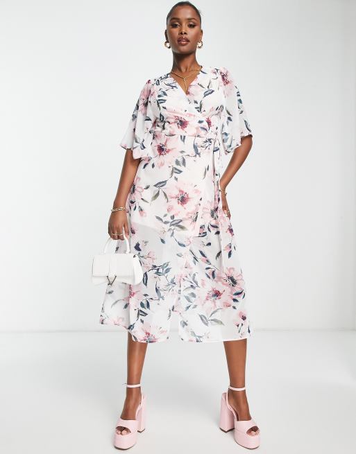 Liquorish – Vit, blommig midiklänning med omlottdesign