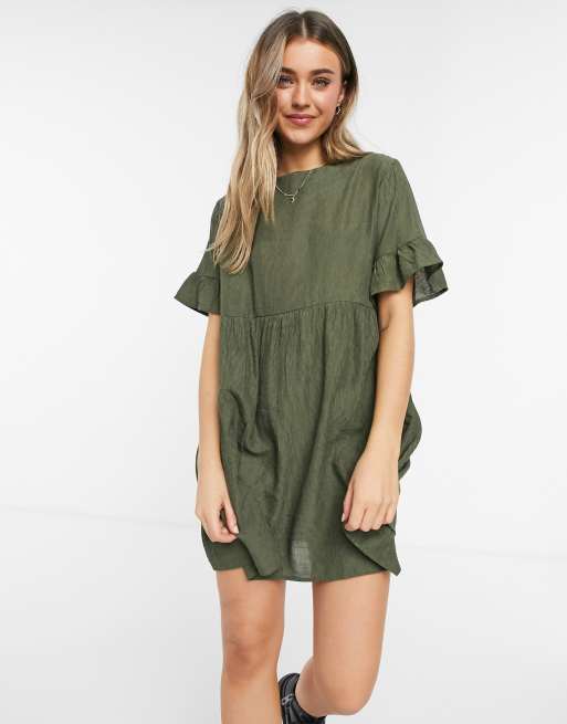 Lola May - Khakigrön klänning i smalspårig manchester med rynkad kjol