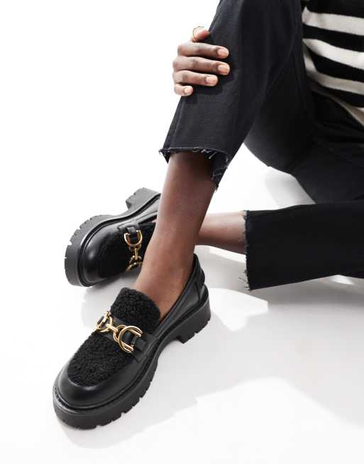 London Rebel Wide Fit – Roxy – Svarta, grova loafers i teddypäls