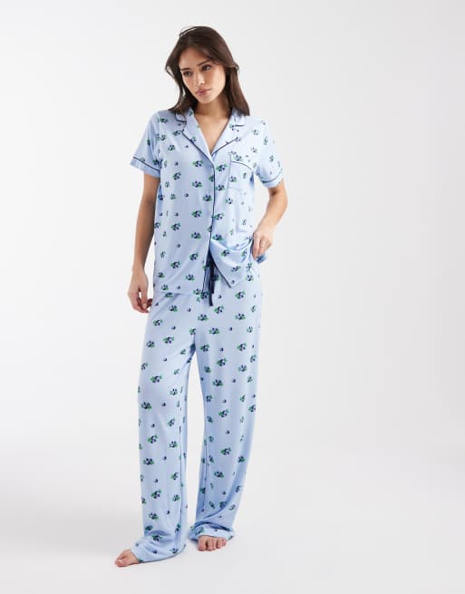 Loungeable – Blåbärsmönstrad pyjamas i supermjuk jersey med vida byxor och topp med platt krage