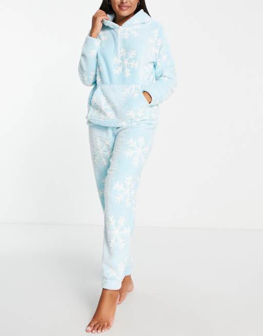 Loungeable – Blekblå myskläder i fleece med snöflingemönster