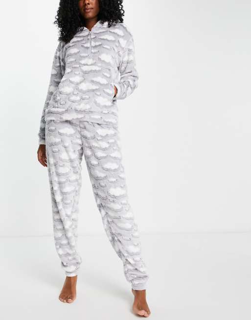 Loungeable – Grå, molnmönstrad pyjamas med dragkedja vid halsen av fleece