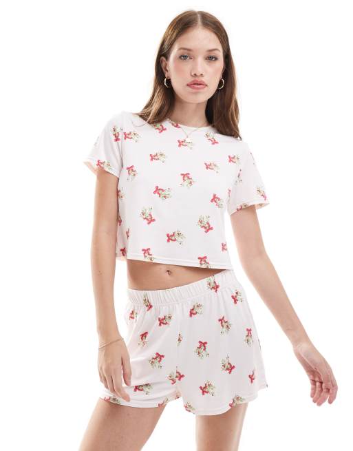 Loungeable – Jul – Ljusrosa, mistelmönstrad pyjamas i jersey med t-shirt och shorts