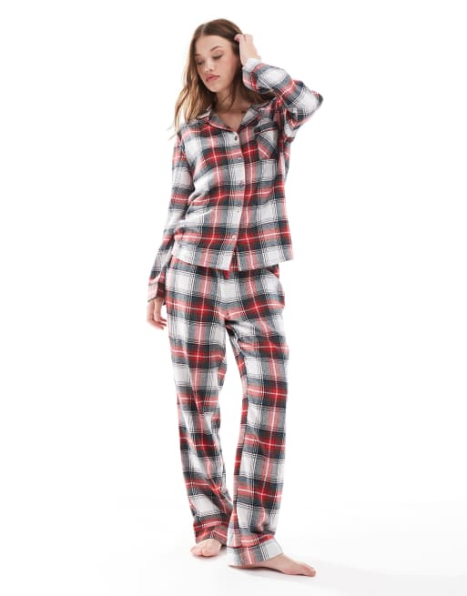 Loungeable – Rutig, borstad pyjamas med byxor och långärmad skjorta med knäppning