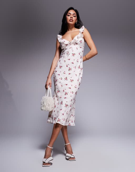 Love Triangle – Blommig och rutig midiklänning med struktur, volang och v-ringning