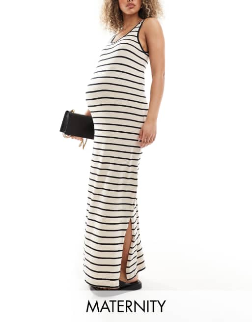 Mamalicious – Mammakläder – Gräddvit, randig, ärmlös maxiklänning med djup halsringning