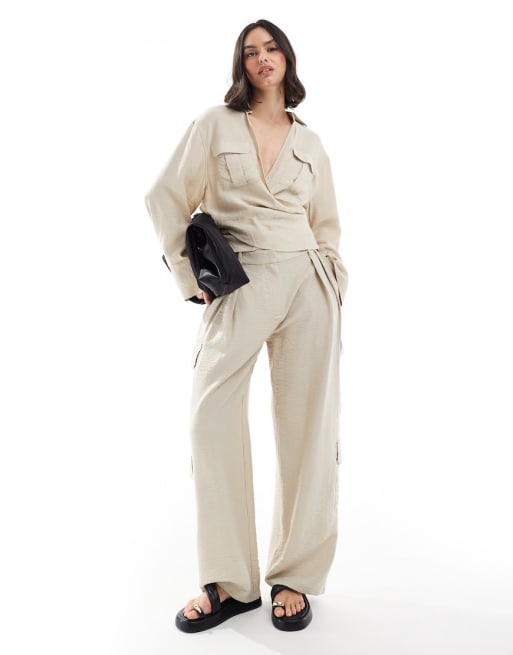 Mango – Beige set med omlottskjorta och avslappnade, raka byxor