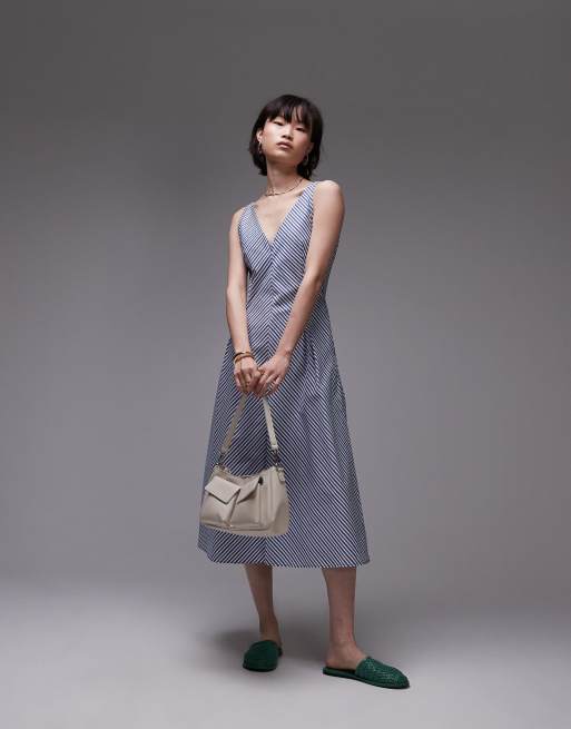 Mango - Blå, randig midiklänning i bomull med v-ringning