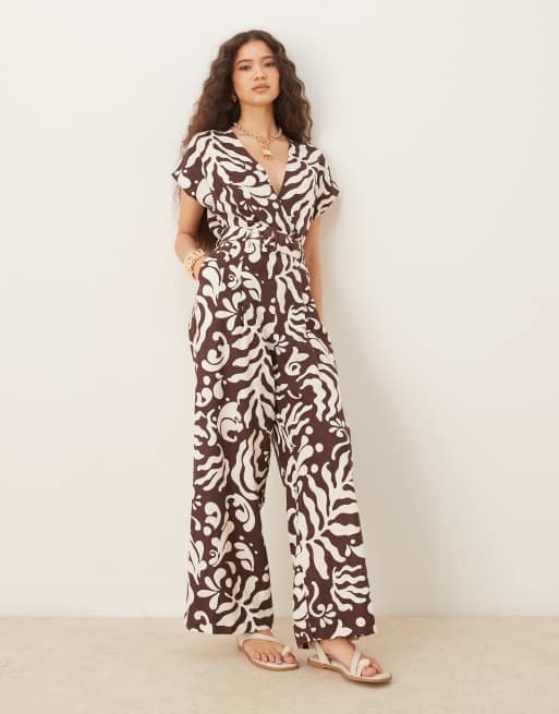 Mango – Brun, blommig jumpsuit med skärp och v-ringning