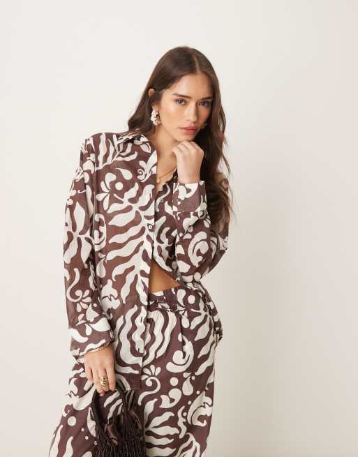 Mango – Brun, långärmad skjorta med abstrakt växtmönster, del av set