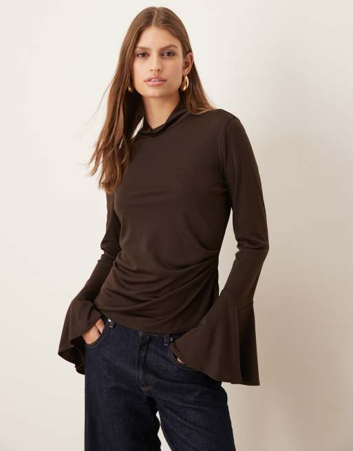 Mango – Brun, långärmad topp med polokrage och utsvängda ärmar