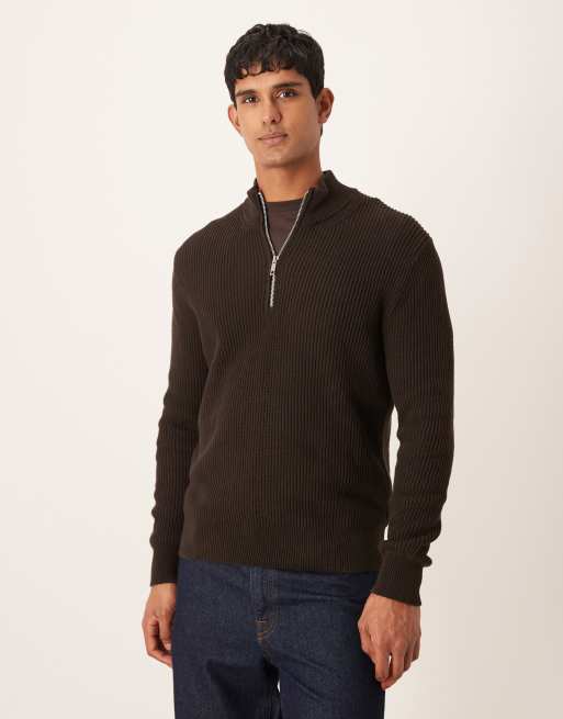 Mango – Brun, ribbad tröja med kort dragkedja vid halsen i bomull