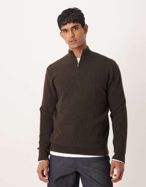 Mango – Brun, stickad tröja i yllemix med kvartslång dragkedja