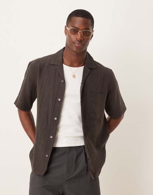 Mango – Chokladbrun, avslappnad skjorta i texturerad bomull med korta ärmar