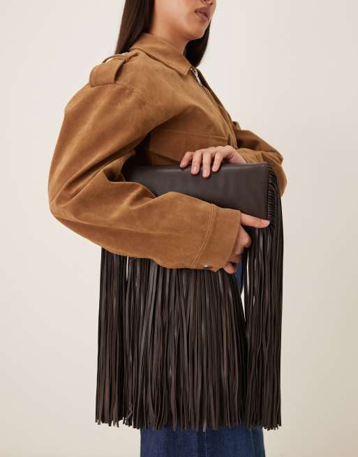 Mango – Chokladbrun, draperad väska i läder med fransar