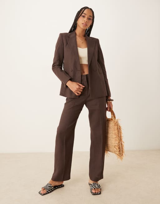 Mango – Chokladbrun kostym med figursydda byxor och dubbelknäppt kavaj i mjuk linne