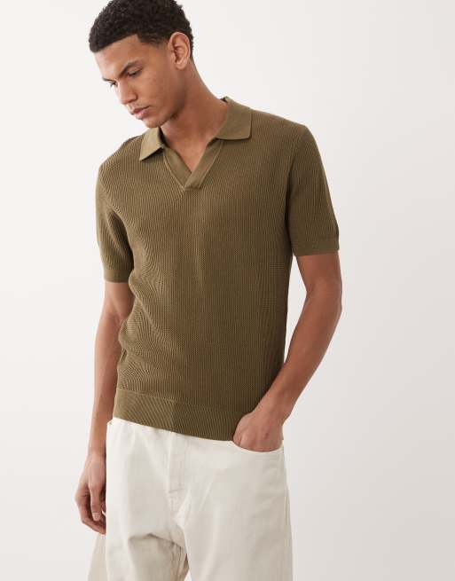 Mango – Kakifärgad, stickad tröja i 100% bomull med korta ärmar och platt krage