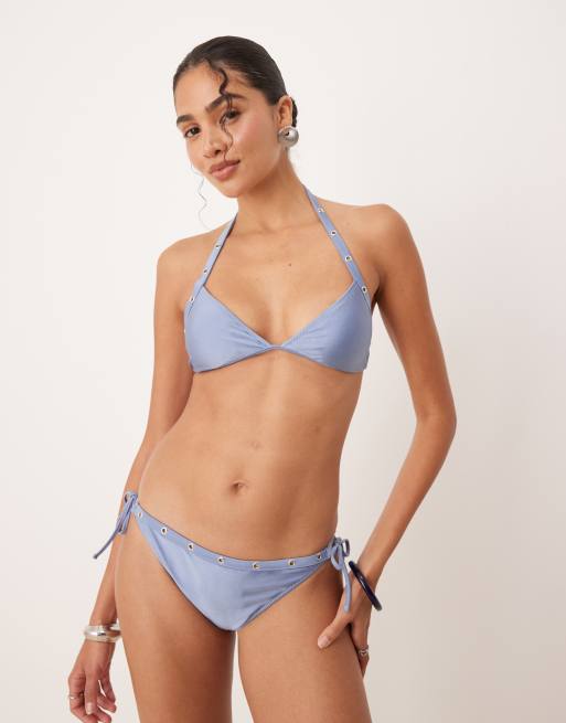 Mango – Ljusblå, metallisk bikiniöverdel med halterneck och nitar