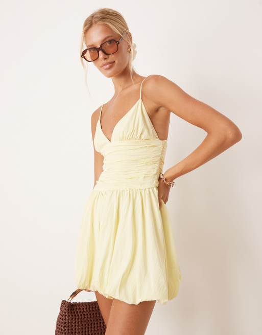 Mango – Ljusgul miniklänning i babydoll-modell med rynkad midja