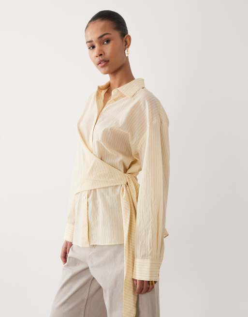 Mango – Ljusgul och svartrandig skjorta i bomullsrikt tyg med knytning i sidan