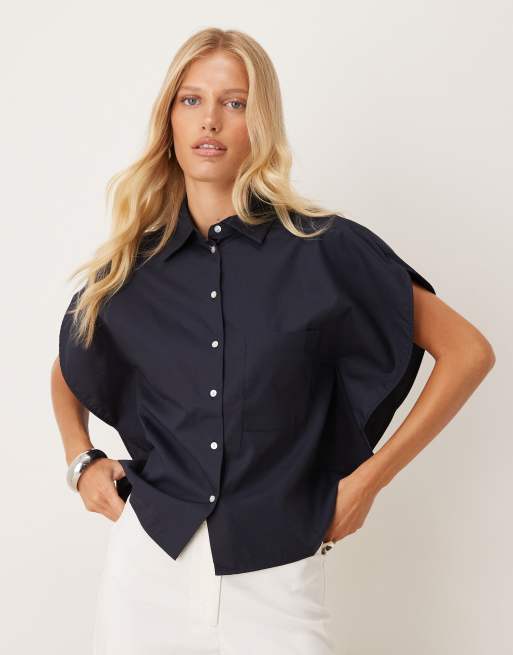 Mango – Marinblå, kortärmad skjorta i bomullsmix och oversize