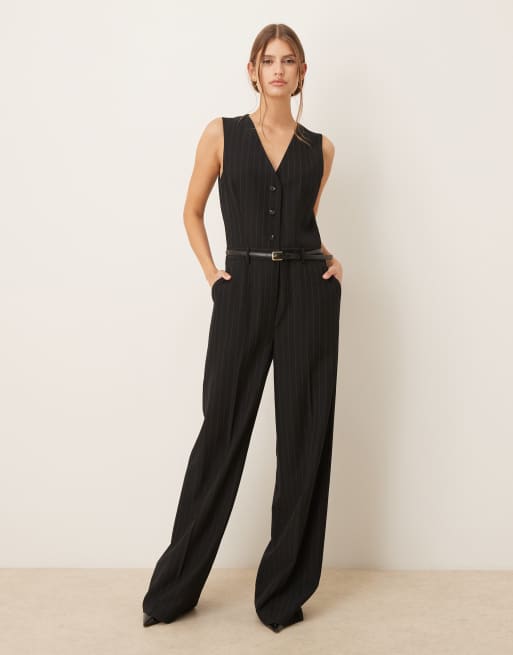 Mango – Marinblå, kritstrecksrandig och figursydd kostymväst med skärp