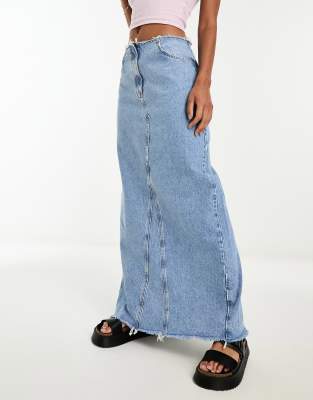 Mango – Mellanblå maxi-jeanskjol med råskuren fåll