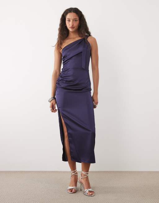 Mango – Mörkblå, enaxlad midiklänning i satin