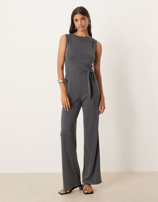 Mango – Mörkgrå, ärmlös jumpsuit med knytning i midjan