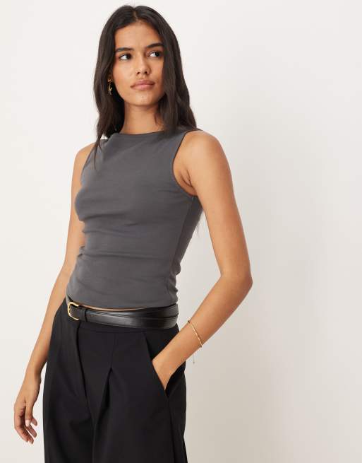 Mango – Mörkgrå, ärmlös topp i bomullsmix med båtringning