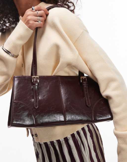 Mango – Mörkröd, glansig axelväska med lång rem