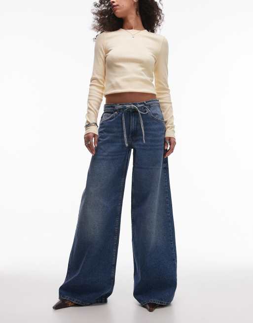 Mango – Olivia – Blå jeans med vida ben och knytning i midjan